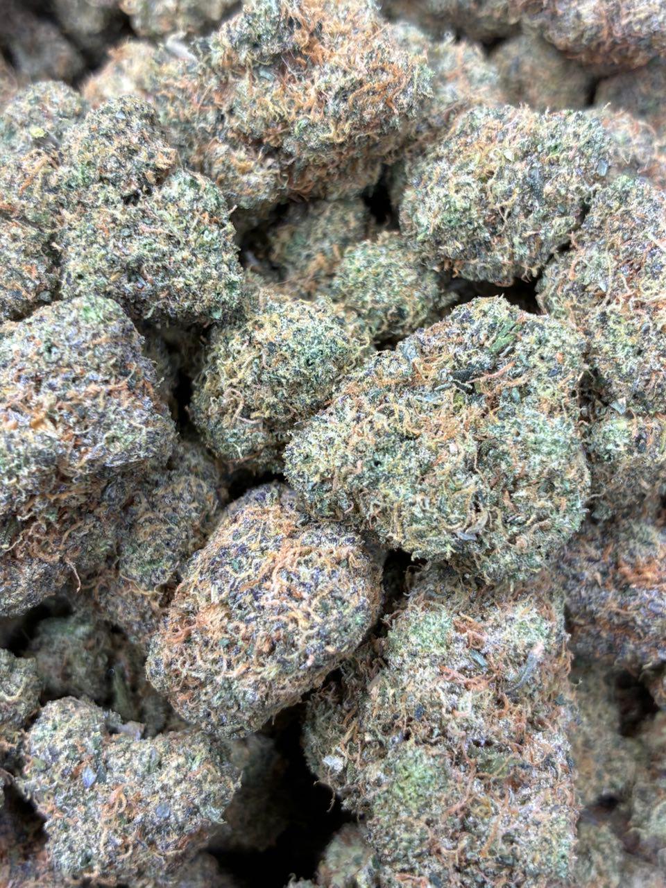 Appearance: Dense, resin-heavy buds with deep green hues, purple accents, and thick trichome coverage.