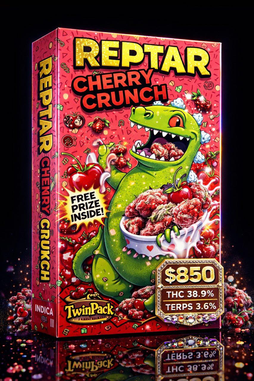 Reptar Cherry Crunch is a flavorful cannabis strain known for its bold cherry sweetness and crunchy, dessert-like undertones. This potent hybrid delivers a smooth smoke with fruity, slightly tangy notes and balanced effects that promote relaxation, mood elevation, and a satisfying, long-lasting high.